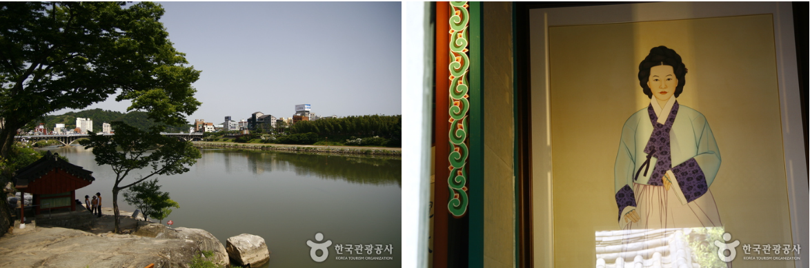 좌: 논개가 왜장과 함께 남강으로 뛰어내린 의암 / 우: 논개의 손가락에 끼워진 가락지가 눈길을 끈다