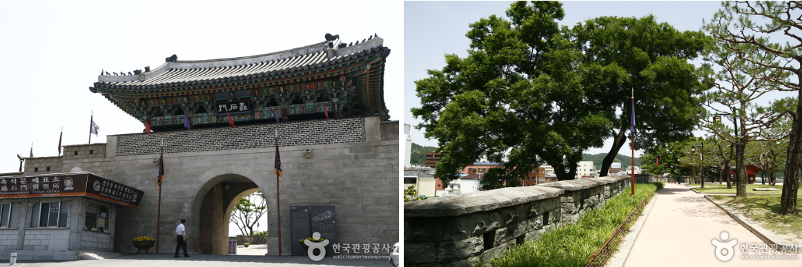 좌: 진주성 촉석루 방향으로 들어가는 문인 촉석문/ 우: 한 바퀴 산책하기 좋은 진주성 안