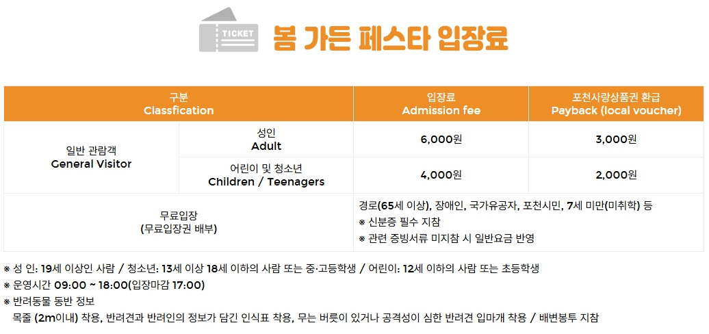 - 관외 성인: 6,000원 (포천사랑상품권 3,000원 환급)